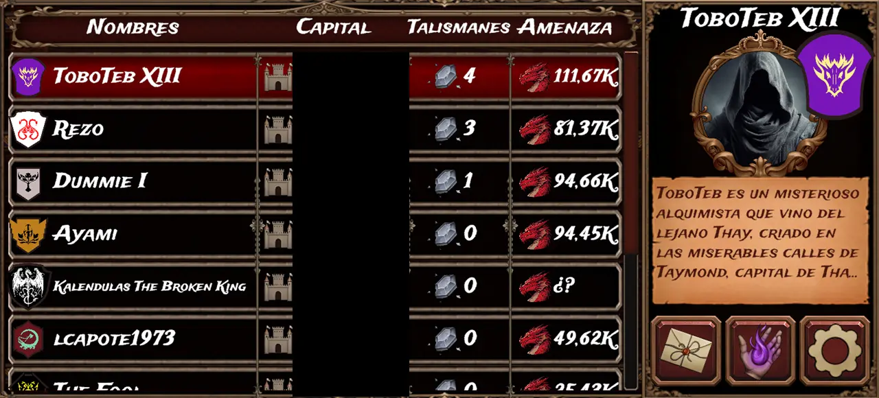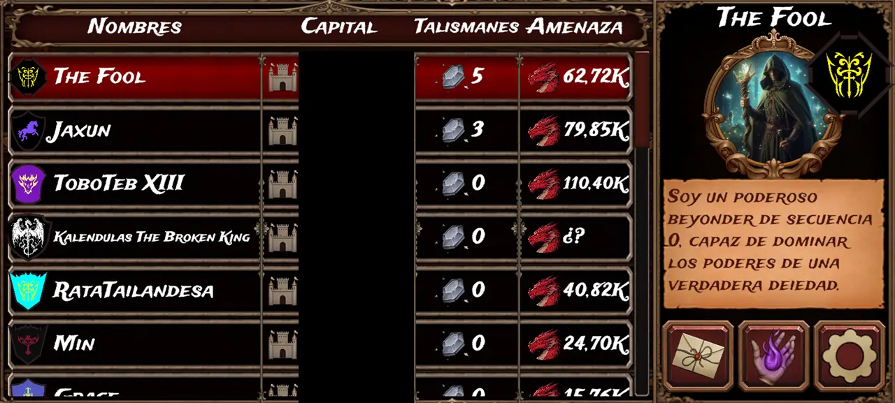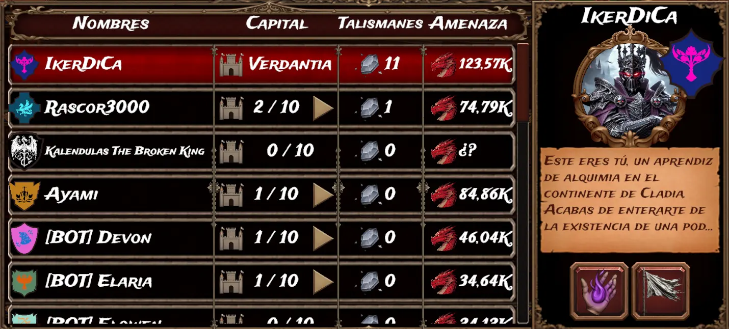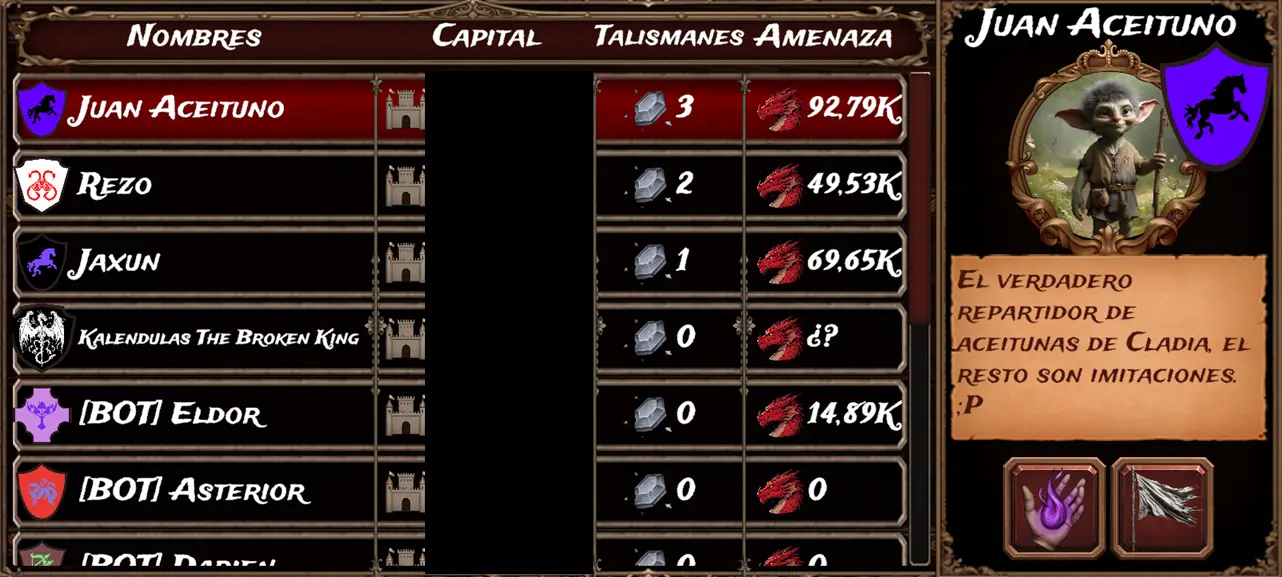 Aarón (playing as "Juan Aceituno") is currently leading in both threat and talismans.