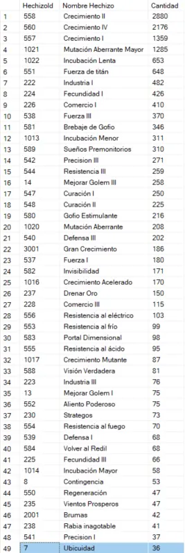 Aquí podemos observar un cambio de popularidad de conjuros, en el análisis anterior el top 5 eran Crecimiento I, Crecimiento IV, Crecimiento II, Mejorar Golem III y Mutación Aberrante Mayor. Ahora, el Crecimiento I se ha desplomado hasta el 3º puesto y el mejorar golem III ha tenido una caída aun mayor... Ha descendido hasta el puesto 16 (sí, del 5º al 16º)