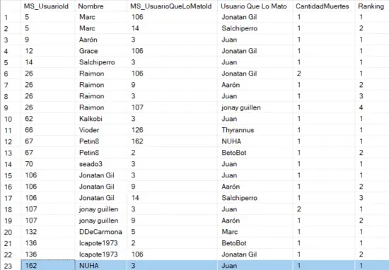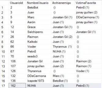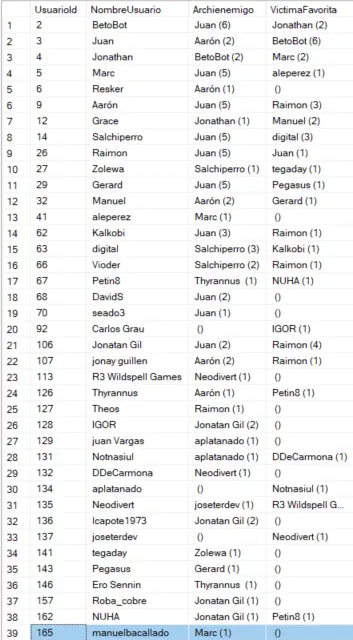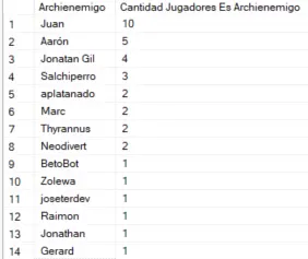 Ahora, por si no os habíais dado cuenta de por qué el meme de que Jaxun (Juan) es tu Archienemigo... En esta tabla vemos para cada jugador cuantas veces es archienemigo de alguien y por qué Jaxun es el archienemigo de todo habitante de cladia que se precie.