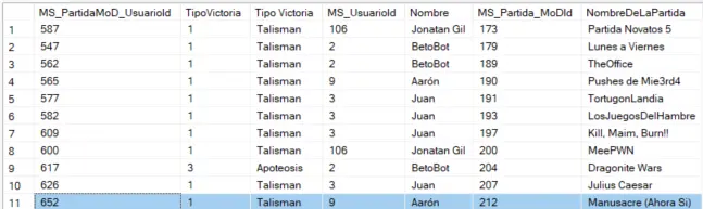 En este caso, la partida más rápida ha sido la última masacre "Manusacre (Ahora Si)" que terminó en el turno 9. La siguiente también es una partida del tipo masacre, "LosJuegosDelHambre".