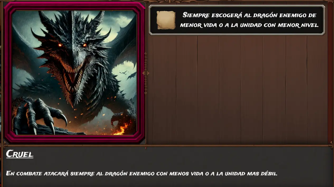 Está claro que todo depende de la situación, por que además, si nuestro adversario sabe que tenemos cruel en algún dragón puede, adrede, subir de edades a algunos dragones para que desviar los ataques al dragón con mayor esquiva por ejemplo o al que más se cura vida. Esta táctica la hemos visto anteriormente en Jaxun cuando algunos jugadores seleccionaban la dote de "Desafiante" (la contraparte de cruel) la cual hace que tus dragones ataquen siempre al dragón de mayor edad o a la unidad de mayor vida... Jaxun al obtener ese dato tras un combate en una torre secundaria contra solo un golem, subió a más de 700 años al dragón que tenía más esquiva de su grupo haciendo que los dragones de sus enemigos fallasen más ataques de lo normal por elegir siempre al dragón con mayor esquiva.