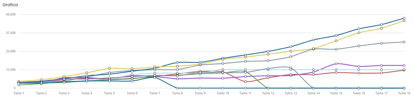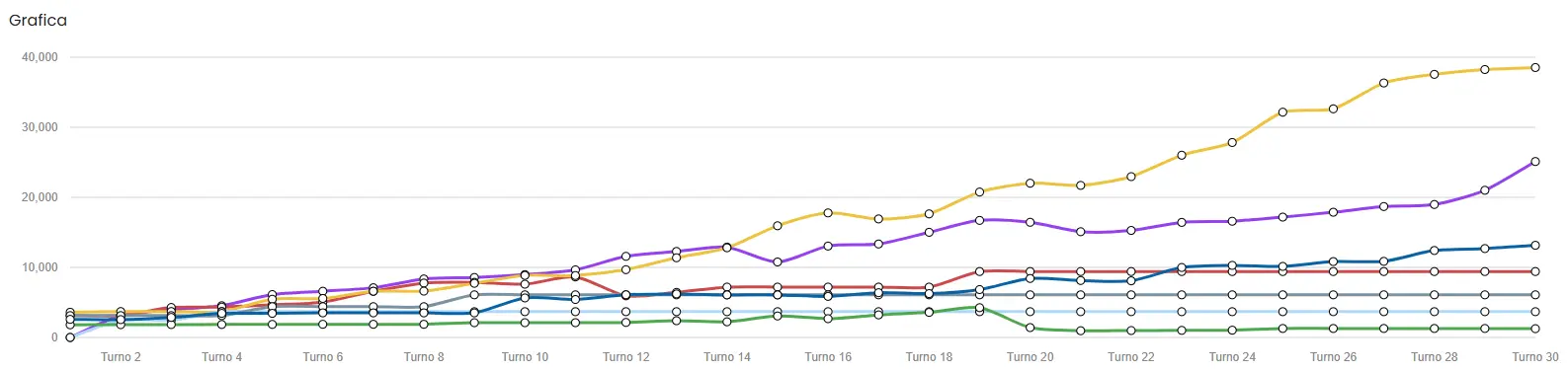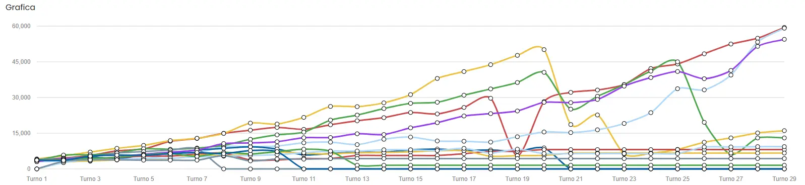 Bueno, la gráfica es bastante explicativa, Jaxun llevaba encabezando el ranking durante toda la partida seguido de muy de cerca por mi (Aarón), no solo por amenaza sino también por cantidad de talismanes... Hasta que en el turno 21, como comentamos en el apartado anterior, decidió atacar mi capital con toda su tropa. El combate fue muy sangriento, una auténtica masacre, los dos perdimos prácticamente todos nuestros dragones pero conseguí sobrevivir dando lugar a otro nuevo meme en el mundo de cladia...