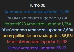 Leyenda de colores por jugador con su amenaza en el turno 30 de partida.