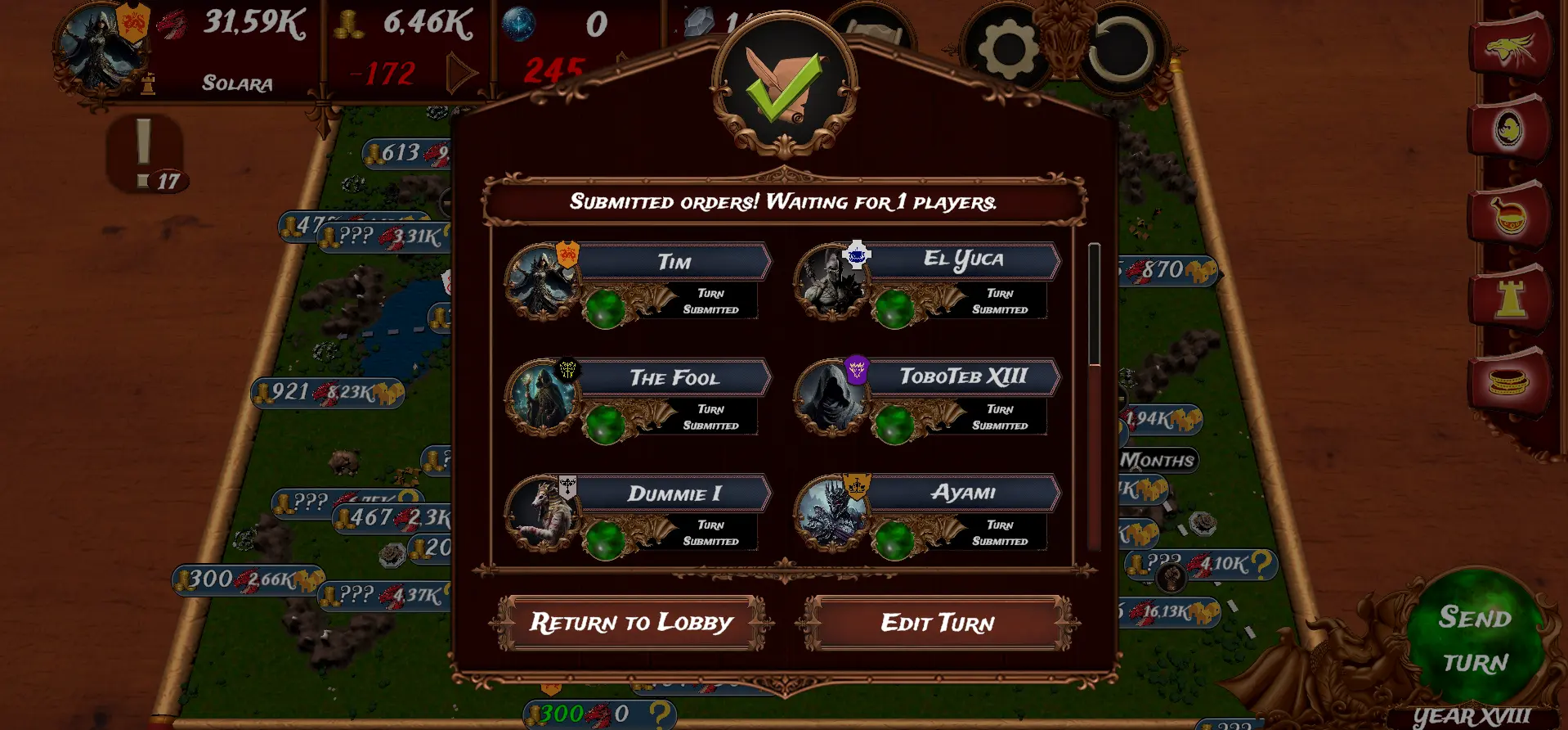 Enviar el turno o entrar en una partida multijugador cuando ya se ha enviado el turno ahora mostrará un listado de los jugadores de la partida con un indicador mostrando si ha enviado, o no, el turno.