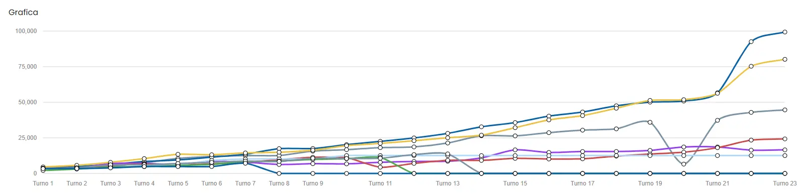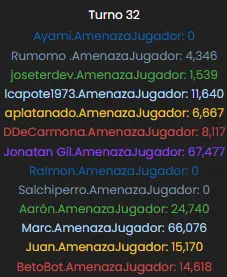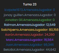 Well, the graph is quite self-explanatory. Jaxun had been leading the ranking throughout the entire match, followed very closely by me (Aarón)—not only in terms of threat but also in the number of talismans... That is, until turn 21, as mentioned in the previous section, when he decided to attack my capital with his entire army. The battle was extremely bloody—a total massacre. Both of us lost practically all of our dragons, but I managed to survive, giving rise to yet another new meme in the world of Cladia...