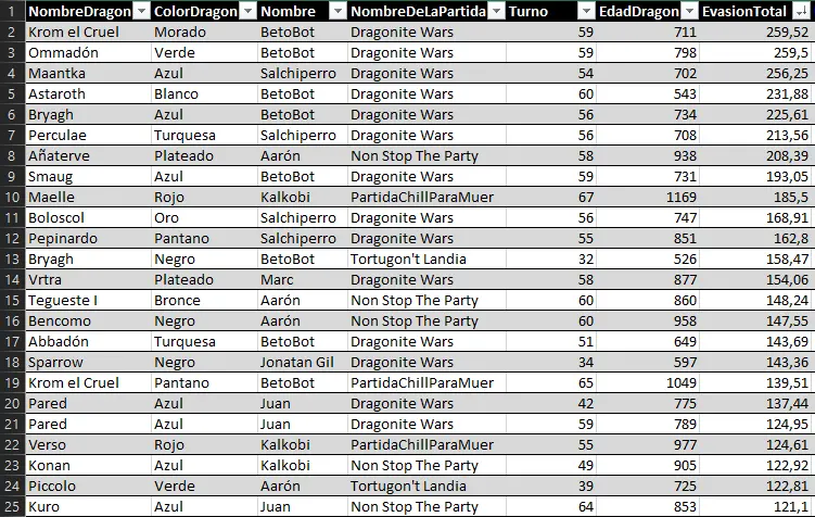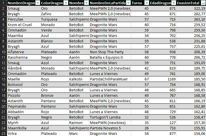 Aquí podemos destacar la anomalía del dragon Myrrh de Raimon, el cual con apenas 127 años consiguió unos muy respetables 157 puntos de evasión. El cual ha conseguido el logro de ser el primer dragón de menos de 500 años en entrar a un top 25 de stats.