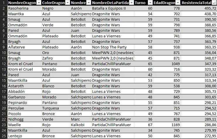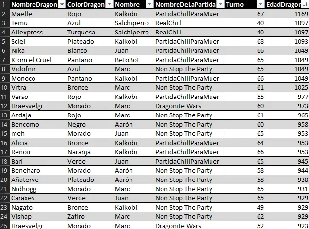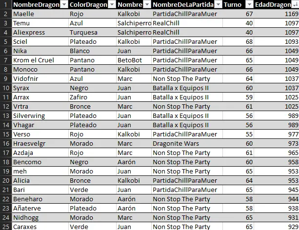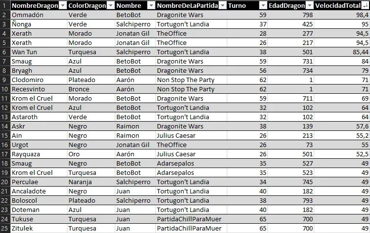 Ahora el ranking de la estadística de velocidad. Este es el ranking más raro pues el ganador es un dragón de 93 años Askr de Raimon y encima es el primer ranking de este blog en el que entran dragones de 1 año. Sí, como lo oyes, una cría recién nacida entra en el ranking de los dragones más veloces de todos los tiempos de Cladia.